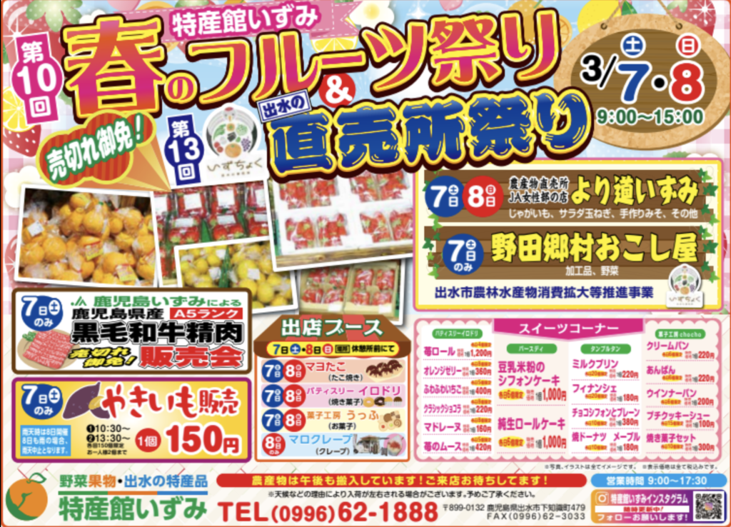 今週末の3月7日(土)・8日(日)の2日間、「第10回 春のフルーツ祭り & 第13回 出水の直売所祭り*を同時開催いたします!
